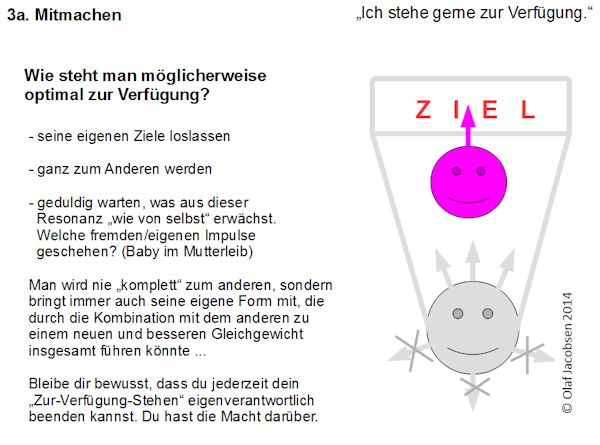 In dem Bild oben sind wir momentan das kleine rote Männchen - und haben den Zustand des "Sich-zur-Verfügung-Stellens" zum Ziel (violettes Männchen). Als violettes Männchen stehen wir dem Ziel eines anderen Menschen oder einer Gruppe anderer Menschen zur Verfügung (schwach rot gefärbtes großes Männchen). Wir haben das Ziel, beim Anderen "mitzumachen".