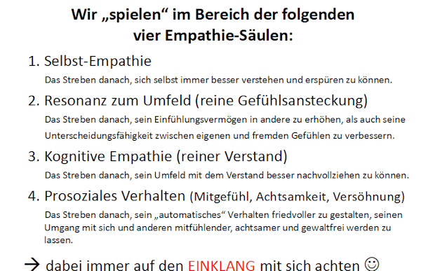 Als weiteren Baustein in diesem Vortrag beim Spiel "Erstes Kennenlernen der Empathie-Schule" werde ich Ihnen nun einige Strukturen, Regeln als auch Inhalte vorstellen.